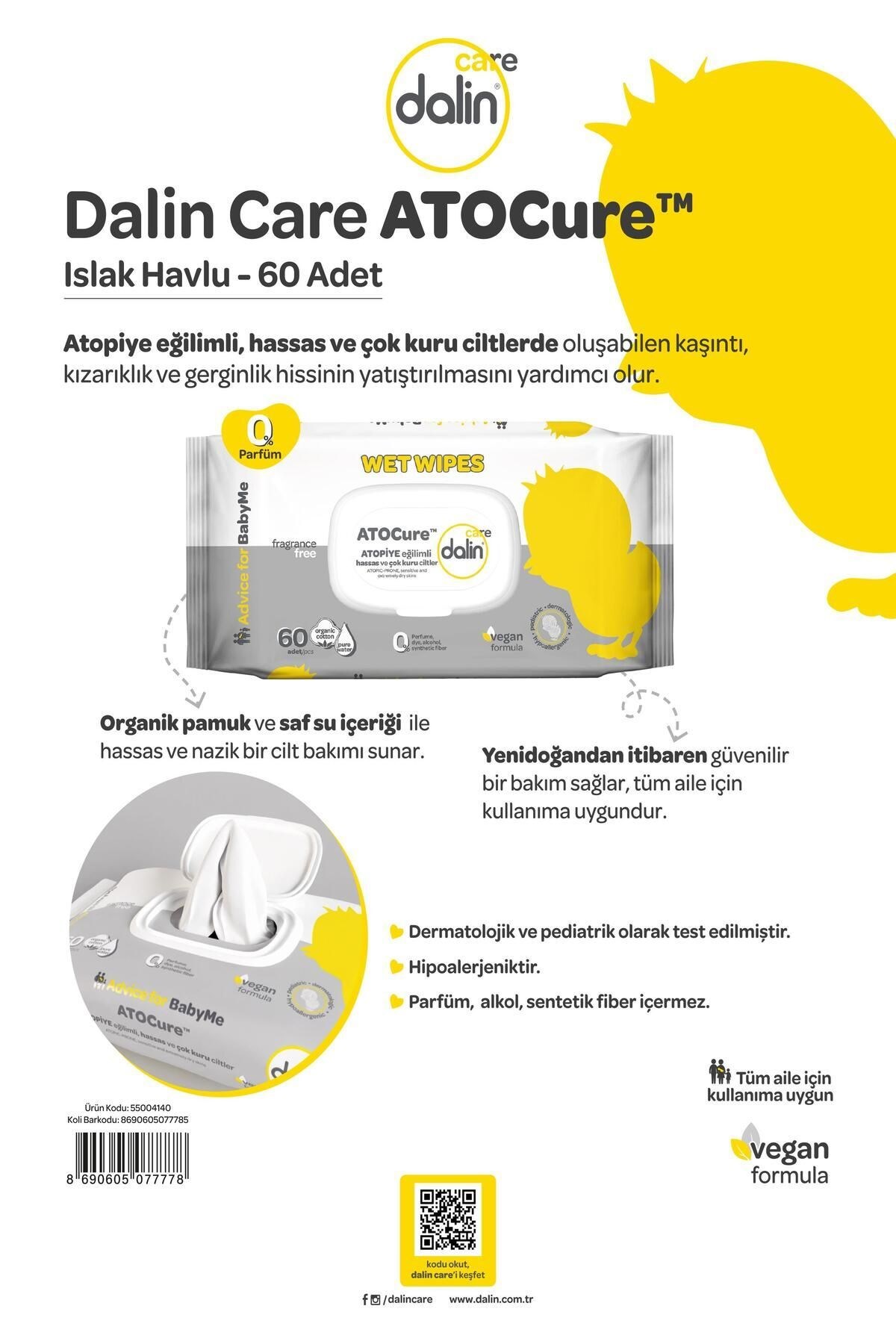 Dalin Care Atocure Islak Havlu 60 AdetÜrün Adı: Dalin Care Atocure Islak Havlu Ürün Markası: Dalin Ürün Boyutu: 60 Adet Özet Bilgi: Hassas Ciltler İçin Islak Mendil Ürün Faydaları: Organik pamuk ve saf su içeriği ile yenidoğandan itibaren güvenle tüm aile kullanabilir.; Hassas ciltlere özel olarak tasarlanmıştır.; Kuru ve çok kuru ciltler için kullanımı uygundur.; Kokusuz ve saf formül.; Kullanım Şekli: Gün içerisinde ihtiyaç duyduğunuz her an kullanımı tekrarlayabilirsiniz.; Daha etkili sonuç almak için Dalin Care ATOCure bakım ürünleri ile birlikte kullanımını öneririz.; *Yeni doğandan itibaren bebeğinizin hassas cildi için güvenlidir.; Tüm aile bireyleri tarafından kullanılabilir.; Ürün Bileşimi: Aqua, Potassium Sorbate