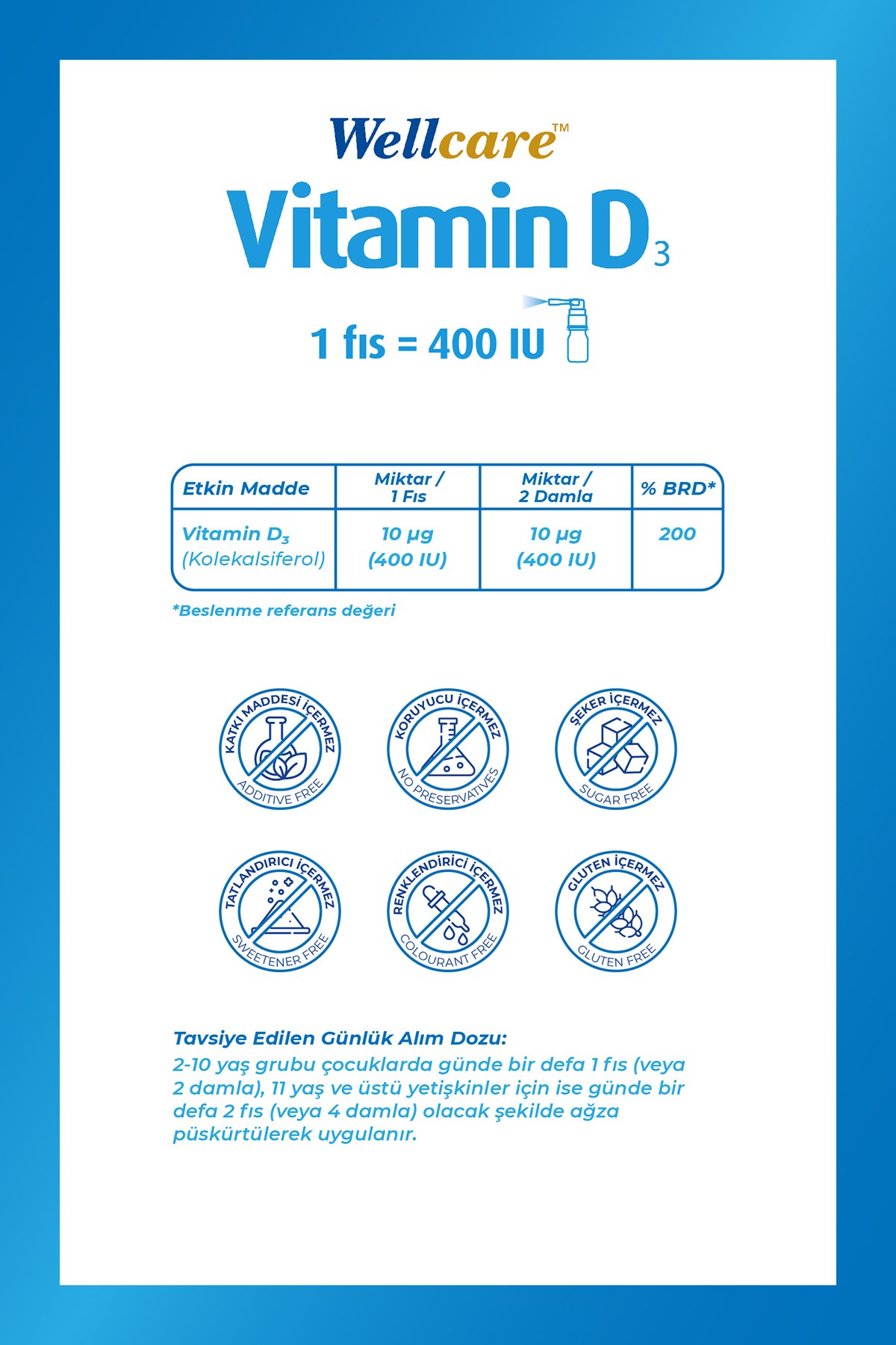 2-10 yaş grubu çocukklarda günde 1 defa 1 fıs ya da 4 damla,11 yaş ve üzeri yetişkinlerde ise güne 1 defa 2 fıs ve ya 8 damla ağıza püskürtülerek kullanılan Vitamin D3 içeren takviye edici gıda.